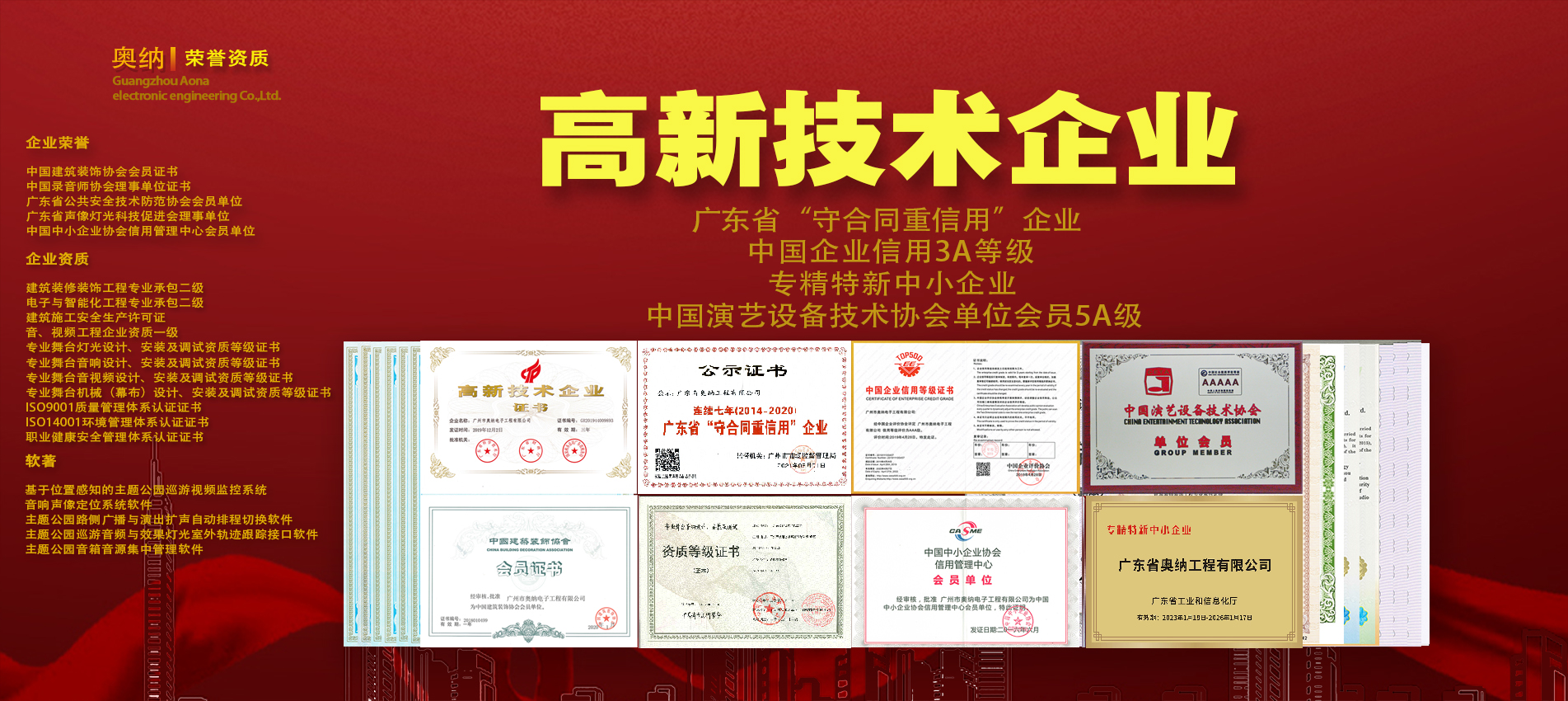 公司現(xiàn)擁有多項(xiàng)資質(zhì)證書(shū),獲得專(zhuān)利和軟著近百項(xiàng),并先后榮獲百?gòu)?qiáng)工程商、優(yōu)秀文旅演藝獎(jiǎng)等獎(jiǎng)項(xiàng),在科學(xué)化、標(biāo)準(zhǔn)化、規(guī)范化方面深得客戶(hù)信賴(lài)。公司參與建設(shè)的“華南理工大學(xué)國(guó)際校區(qū)圖書(shū)館”榮獲2022-2023年度中國(guó)建設(shè)工程魯班獎(jiǎng)。